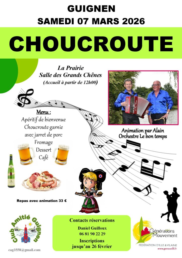 Choucroute à Guignen Publication publiée :29 janvier 2026 Vous devriez également aimer Concours de belote à Guignen 11 avril 2025 Assemblée générale à Pont-Péan 17 janvier 2025 Noël avant l’heure à Pont-Péan 20 décembre 2024