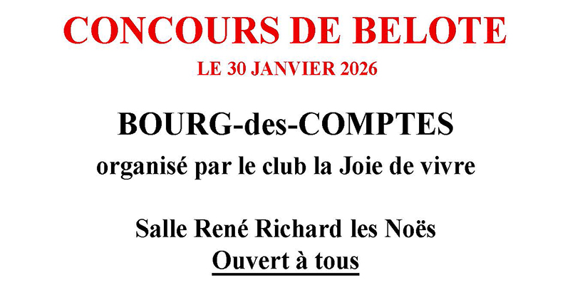Concours de Belote à Bourg-des-Comptes Publication publiée :16 janvier 2026 Télécharger l'affiche Vous devriez également aimer Noël à Bourg-des-Comptes 22 décembre 2025 Guignen a célébré ses 50 ans ! 20 juin 2025 C’est la rentrée à Pont-Péan 13 septembre 2024